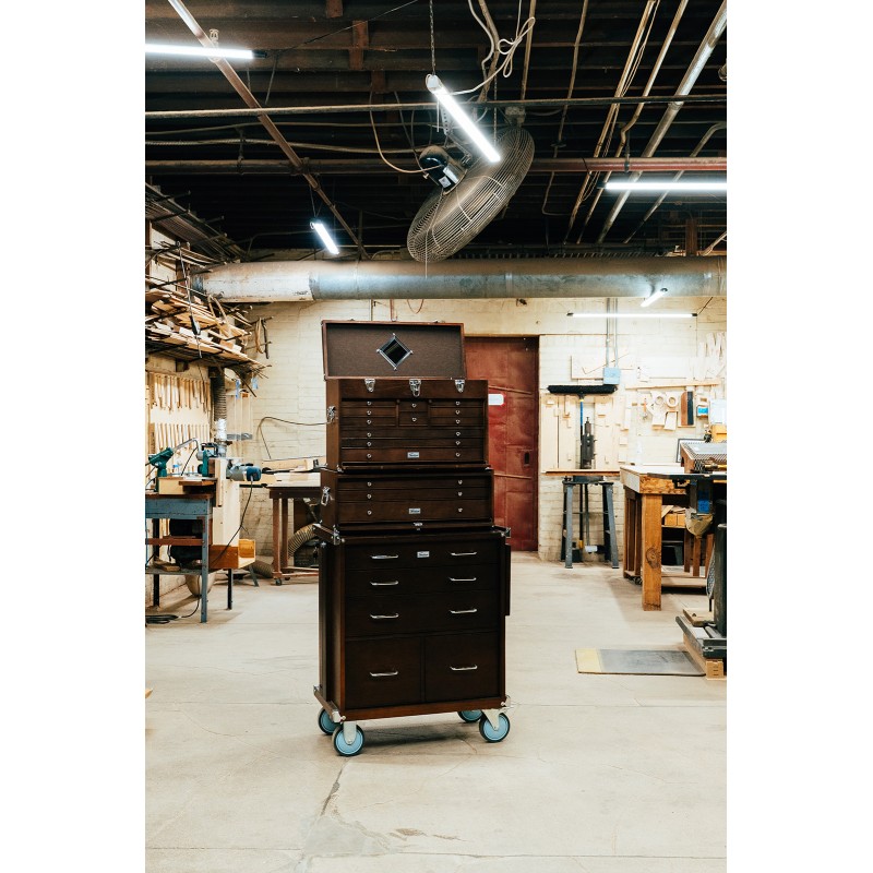 At the top is the GI-T24-D Tool Chest, with 11 felt-lined drawers of varied sizes and a lift-up top compartment. Its drop-front panel stows neatly beneath the drawers when open, then locks shut for security. Centered beneath it is the GI-M24-D Mid-Base, which adds three more drawers and a sturdy shelf to support the full chest above. Together, these two pieces create a furniture-style unit ideal for collections, tools, or fine accessories.