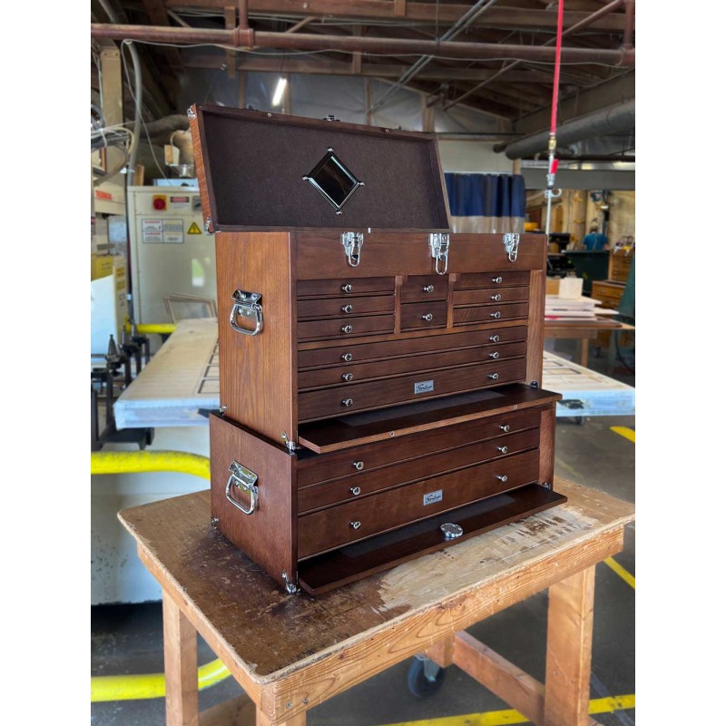 Together, the two chests offer 14 drawers, two locking compartments, and timeless styling in a rich Dark Oak finish. Designed in the USA and built to Gerstner International’s specifications, this set is ideal for tools, collectibles, crafts, or anything that deserves organized, protective storage.