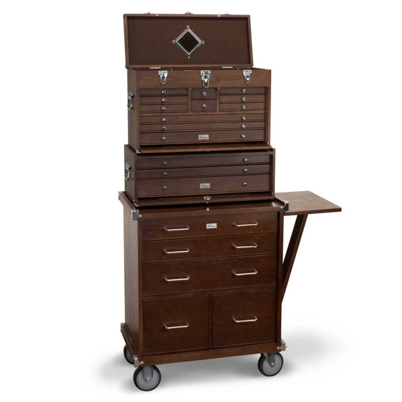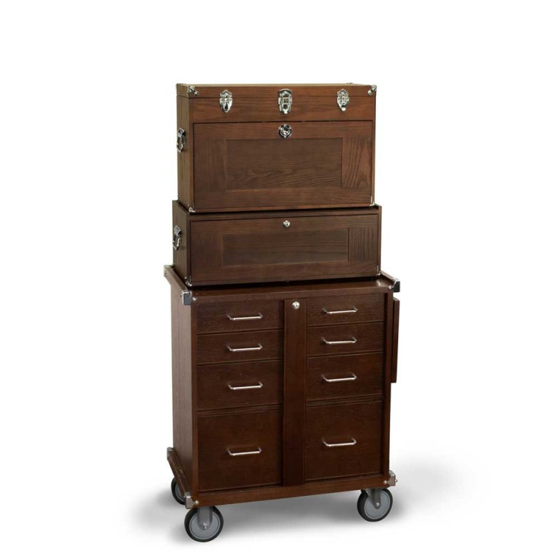 Crafted from solid hardwood and hardwood veneers, the entire set features a deep, warm Dark Oak finish and polished chrome hardware—bringing refined character and practicality to any setting. Every drawer is felt-lined for protection, and every component is designed in the USA and built to Gerstner International’s specifications.