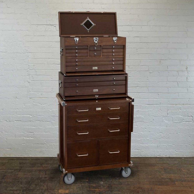 At the top is the GI-T24-D Tool Chest, with 11 felt-lined drawers of varied sizes and a lift-up top compartment. Its drop-front panel stows neatly beneath the drawers when open, then locks shut for security. Centered beneath it is the GI-M24-D Mid-Base, which adds three more drawers and a sturdy shelf to support the full chest above. Together, these two pieces create a furniture-style unit ideal for collections, tools, or fine accessories.